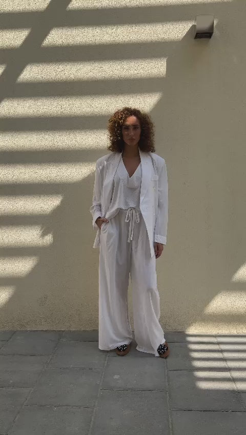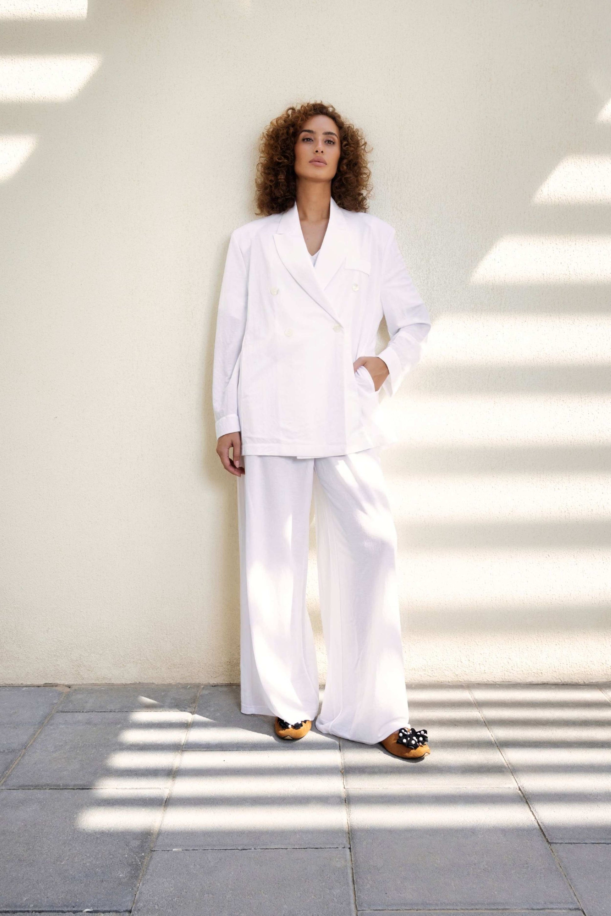 Over sized blazer with shoulder pads. Double breasted button fastening at the front. Side pockets. Hem with double back vent no lining. Two piece set with matching wide leg pants, elastic waist and side pockets. Made of cool light jersey fabric.